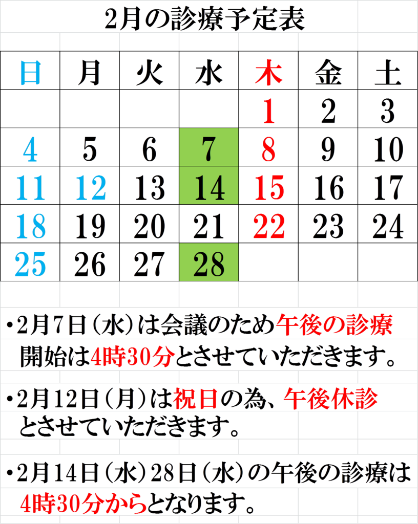 2月の診療時間のご案内
